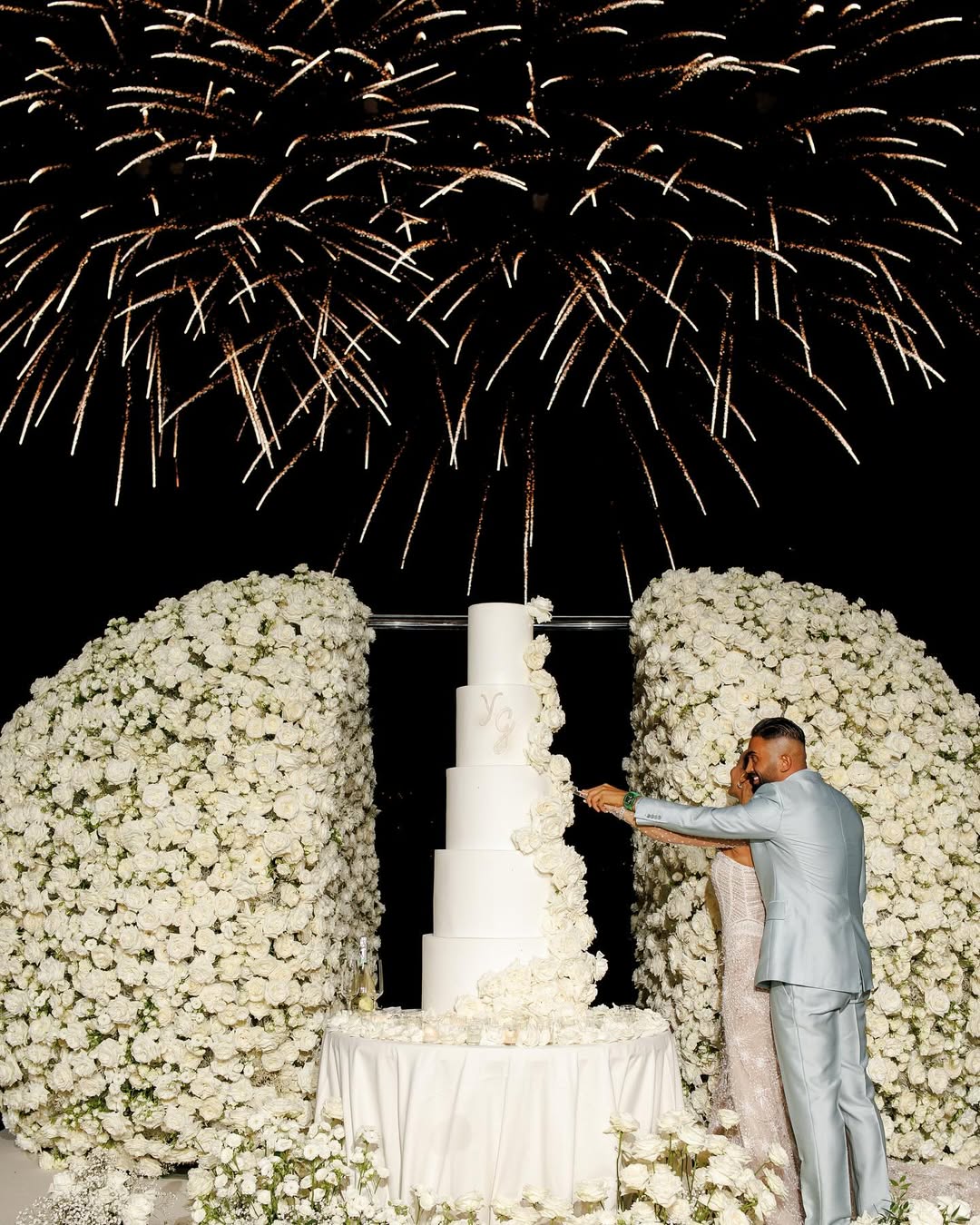 العروسان يومي خوري وغورهان كيزيلوز في لحظة رومانسية من حفل زفافهما الأسطوري